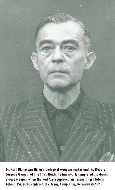 One of these scientists, Kurt Blome, was the Deputy Surgeon General in the Third Reich and headed its biological warfare program. Under the guise of “cancer research,” Blome conducted experiments involving spreading disease through insects like mosquitos and lice. He also ran tests that involved dropping nerve gas and insecticides from planes as well as attempts at creating weaponized bubonic plague. It is likely that the work of Blome and his colleague Dr. Fritz Hoffmann helped the Army Chemical Corps. develop Agent Orange, the herbicide and defoliant that was so devastating in the Vietnam War.